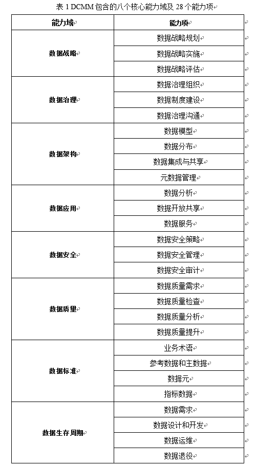 DCMM數(shù)據(jù)管理能力成熟度評(píng)估模型定義了數(shù)據(jù)戰(zhàn)略、數(shù)據(jù)治理、數(shù)據(jù)架構(gòu)、數(shù)據(jù)應(yīng)用、數(shù)據(jù)安全、數(shù)據(jù)質(zhì)量、數(shù)據(jù)標(biāo)準(zhǔn)和數(shù)據(jù)生存周期八個(gè)核心能力域及28個(gè)能力項(xiàng),并以組織、制度、流程和技術(shù)作為八個(gè)核心域評(píng)價(jià)維度。